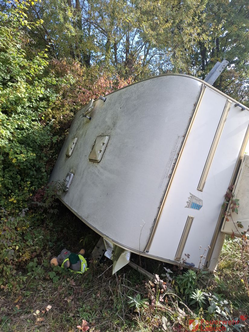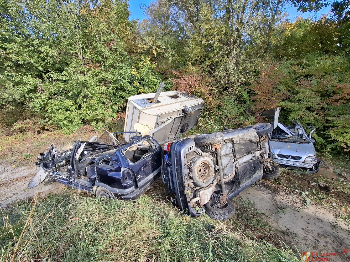Übungsannahme war ein Verkehrsunfall mit mehreren beteiligten Fahrzeugen inklusive eines verunfallten Wohnanhänger und mehreren verletzten Personen.
