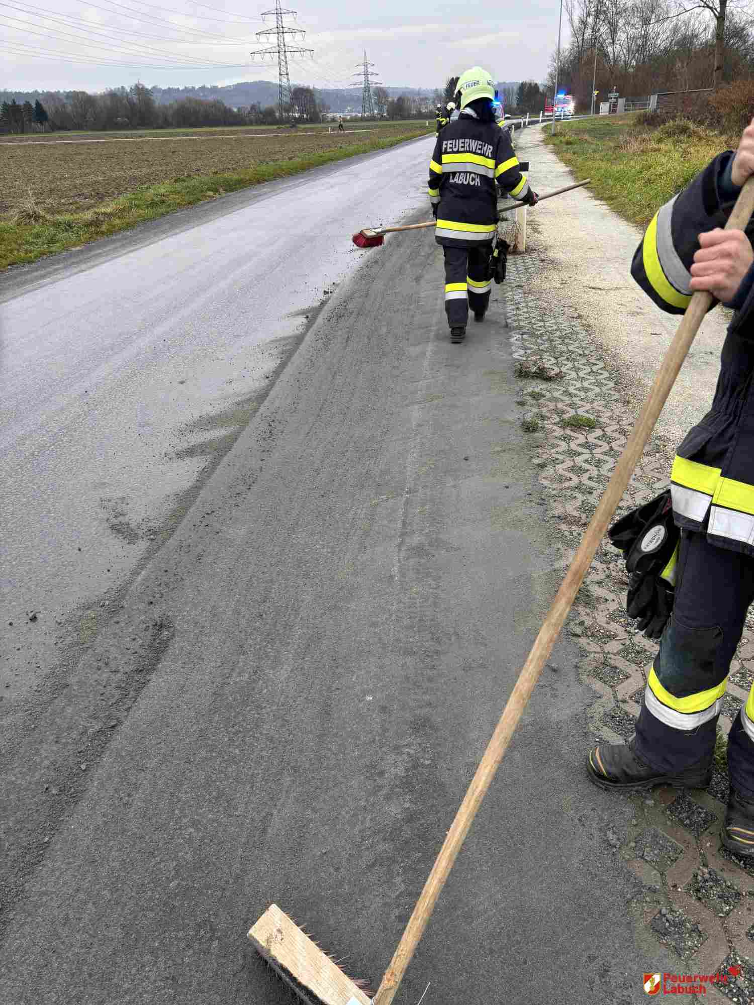 Ein unbekannter Verkehrsteilnehmer hat auf mehreren 100m die Gemeindestraße mit Betriebsmittel verunreinigt. Wir unterstützten die anwesende FW Gleisdorf beim Binden der Betriebsmittel und dem Reinigen der Straße.